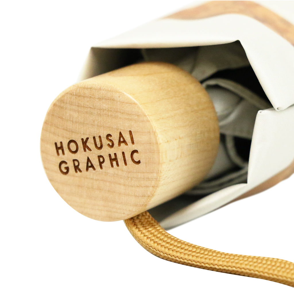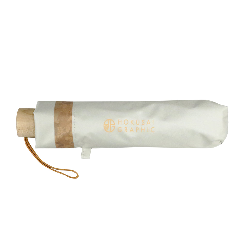 より持ち歩きやすいよう北斎グラフィックの通常の遮光日傘に比べ90g軽い仕様です。骨組みには軽くてしなやかにしなるグラスファイバーを用い、丈夫で雨風にも強い傘となっています。雨傘としても日傘としてもお使いいただけるよう持ち歩く工夫が随所に施された、デザイン性と使いやすさと備えた折りたたみ傘です。
