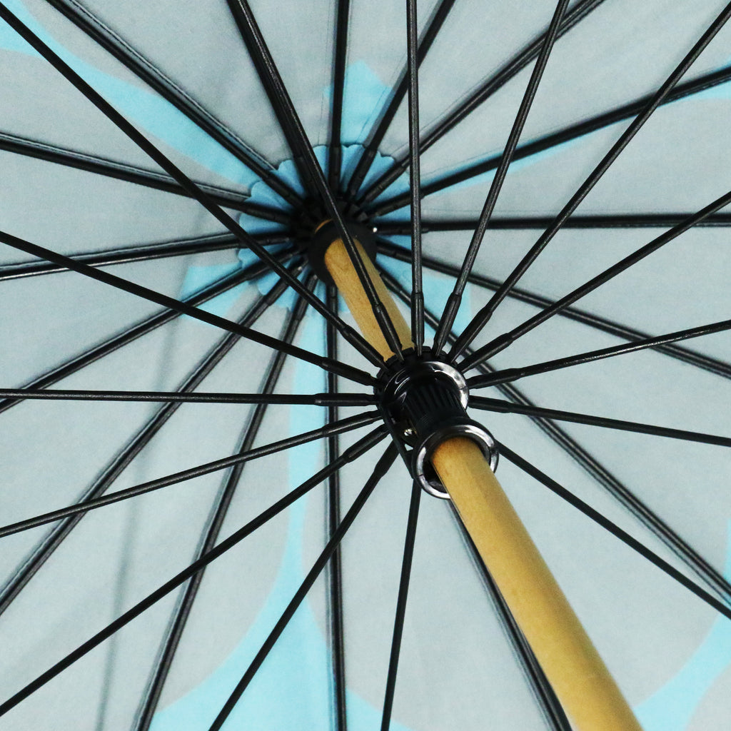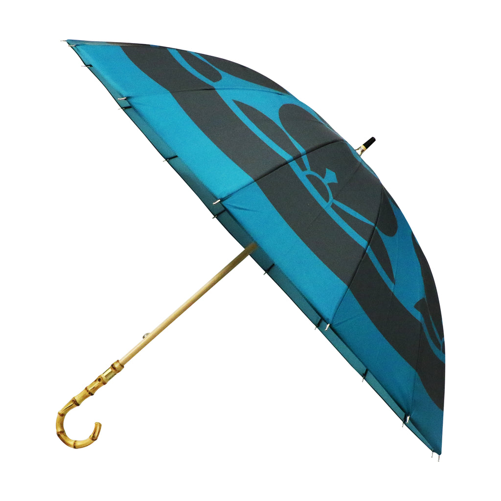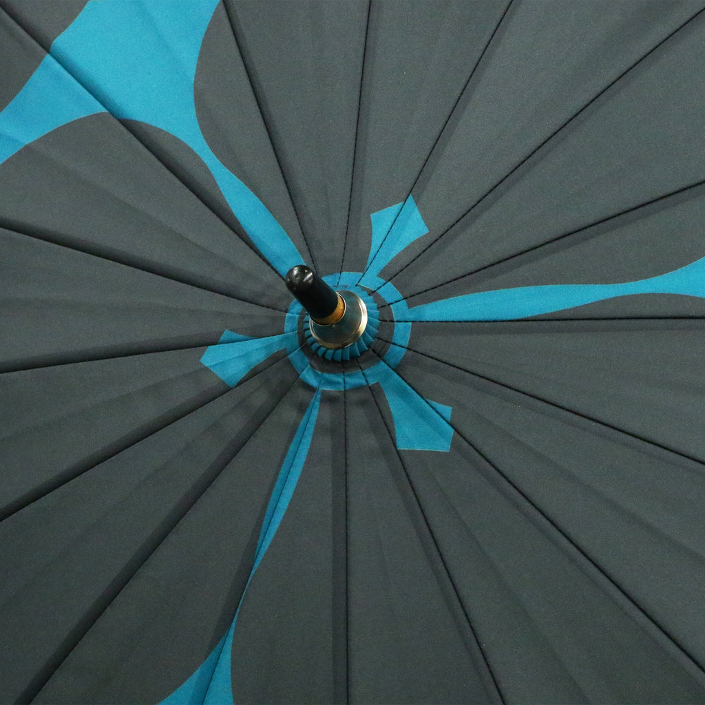 傘布全面に大胆でモダンな和柄のグラフィックデザインを施した16本の骨組の長傘です。16本の骨組みに合わせて柄を職人による手作業でつなぎ合わせており、繋ぎ目も綺麗です。持ち手には節がしっかりとした天然の竹を使用、粋で高級感もたっぷりの仕様です。竹には曲げ加工を施し、持ちやすくかわいらしいシルエットに。また、ブランドロゴを施したオリジナルプレートを使用。骨組みには軽くてしなやかにしなるグラスファイバーを用い、丈夫で雨風にも強い傘となっています。黒色の骨はサビが目立ちにくく、デザイン性と使いやすさと備えた長傘です。またUVカットを施しておりますので、晴雨兼用で日傘としてもお使いいただけます。