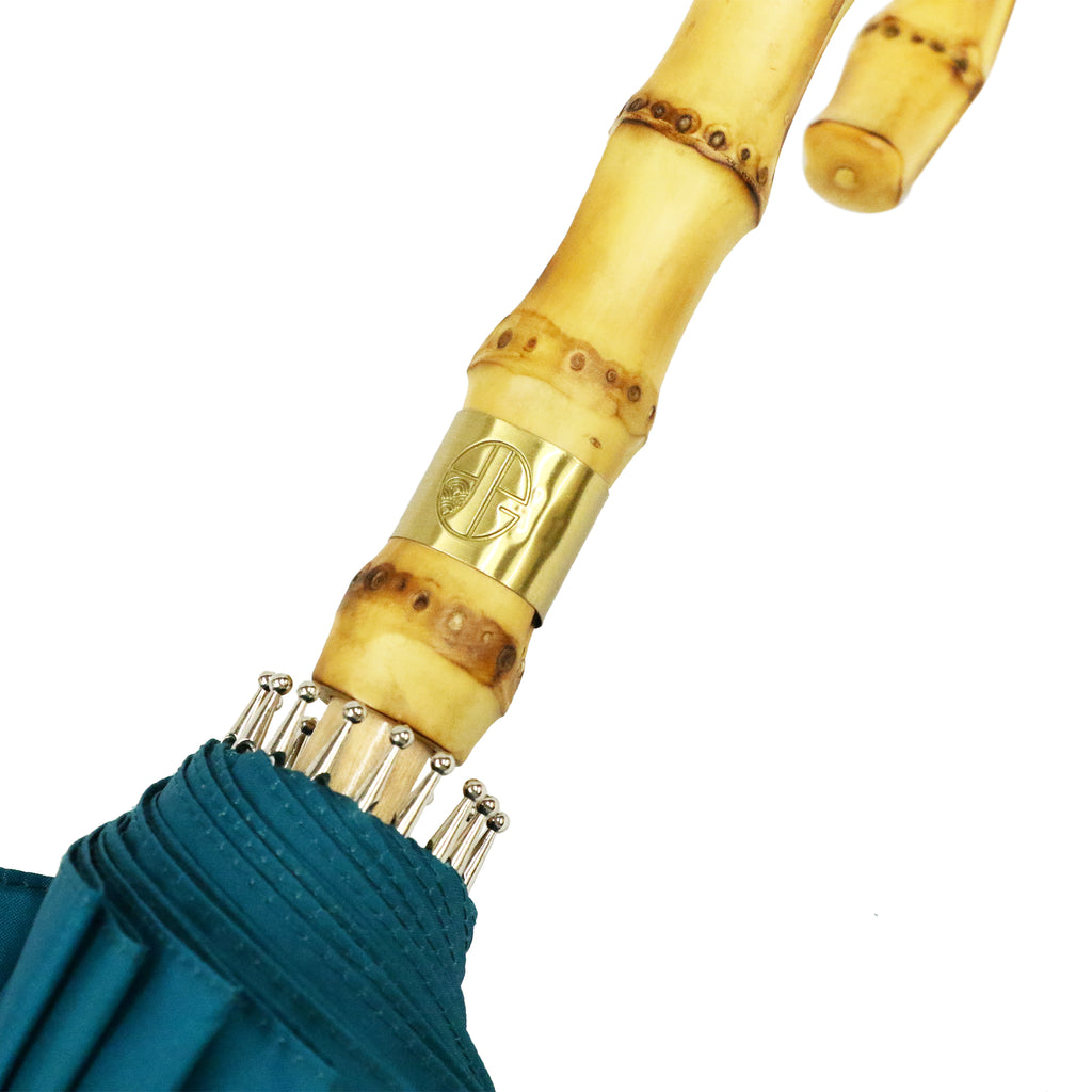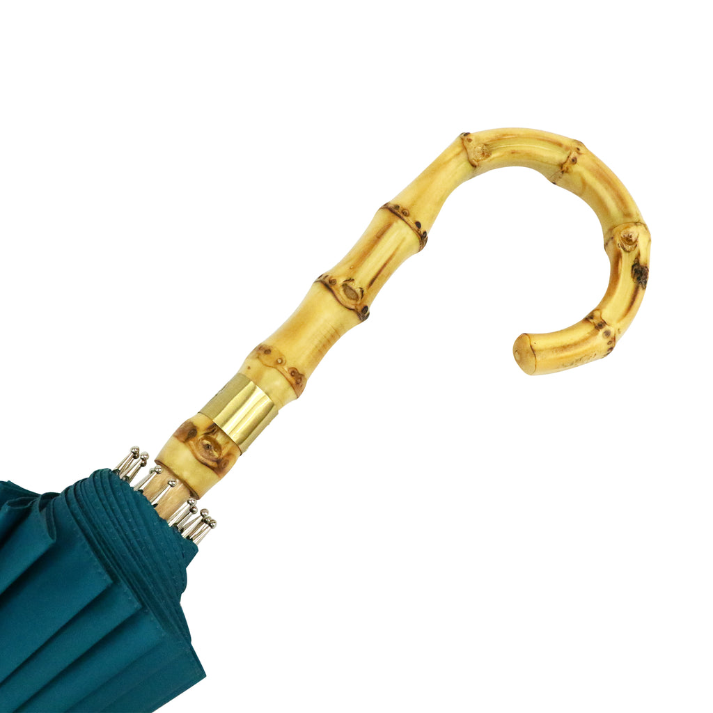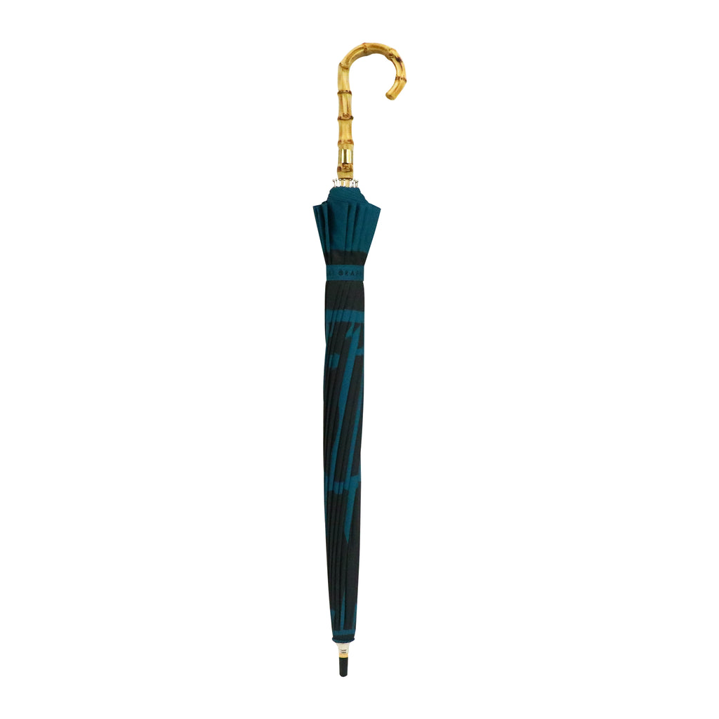 傘布全面に大胆でモダンな和柄のグラフィックデザインを施した16本の骨組の長傘です。16本の骨組みに合わせて柄を職人による手作業でつなぎ合わせており、繋ぎ目も綺麗です。持ち手には節がしっかりとした天然の竹を使用、粋で高級感もたっぷりの仕様です。竹には曲げ加工を施し、持ちやすくかわいらしいシルエットに。また、ブランドロゴを施したオリジナルプレートを使用。骨組みには軽くてしなやかにしなるグラスファイバーを用い、丈夫で雨風にも強い傘となっています。黒色の骨はサビが目立ちにくく、デザイン性と使いやすさと備えた長傘です。またUVカットを施しておりますので、晴雨兼用で日傘としてもお使いいただけます。