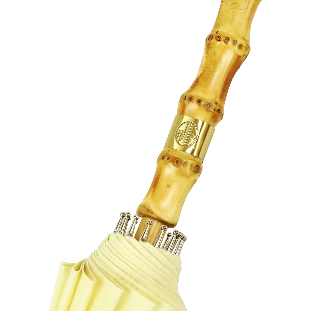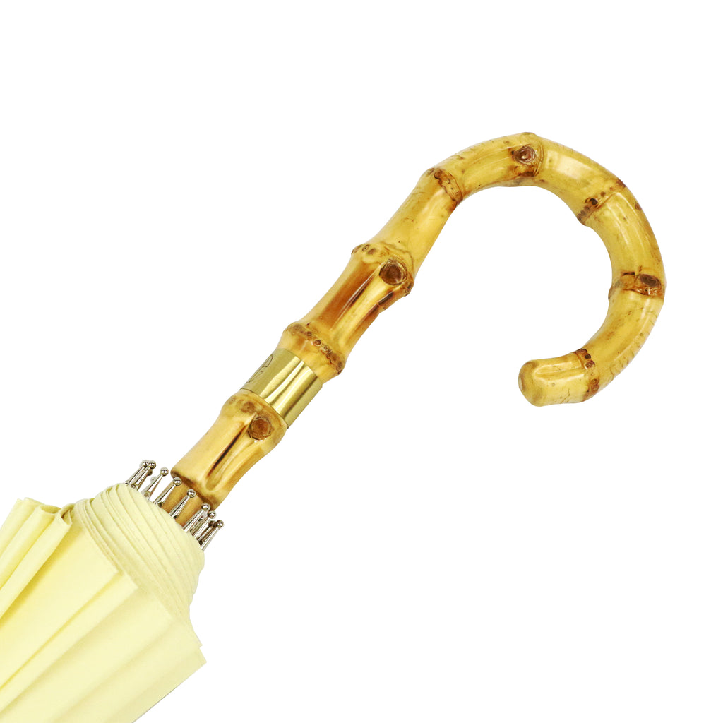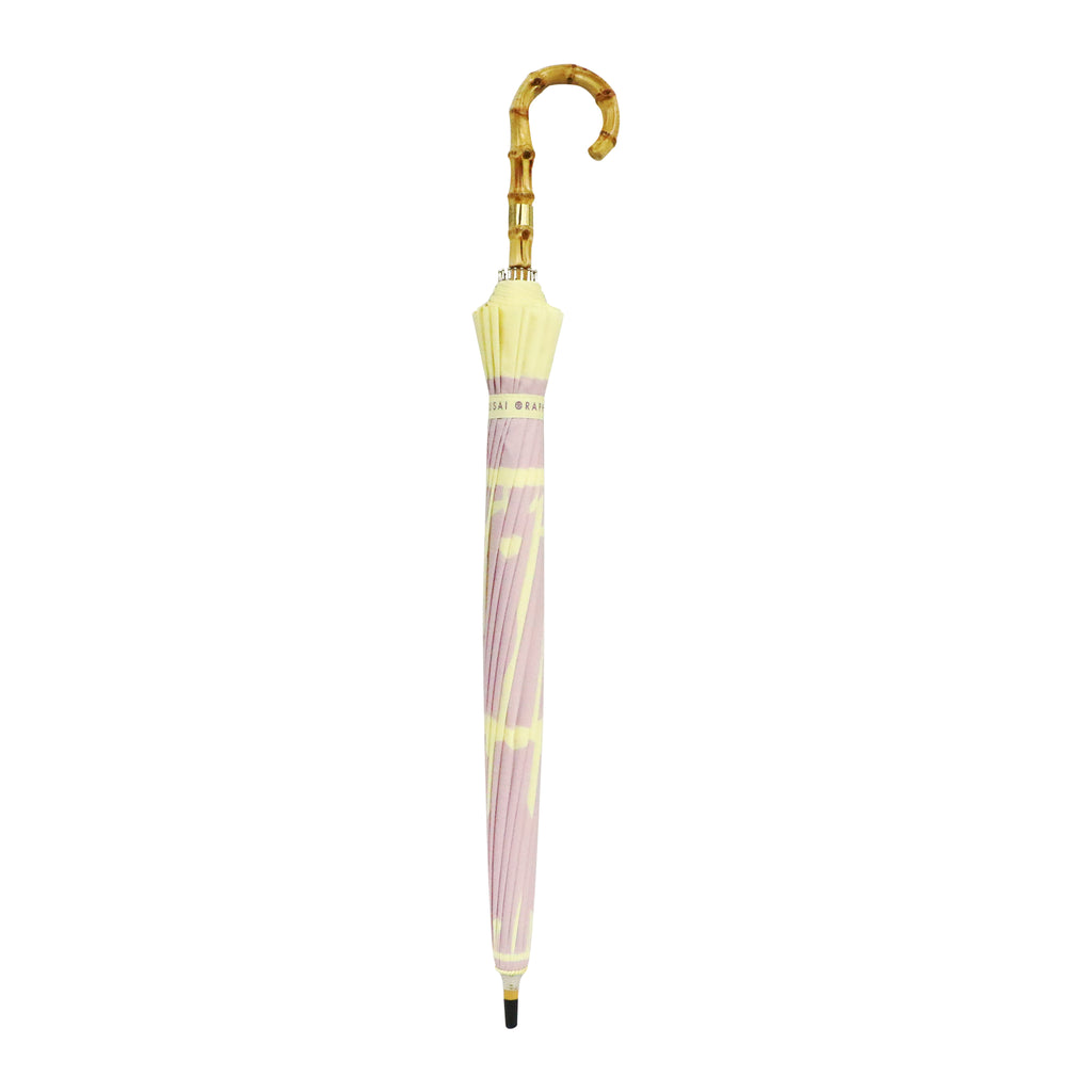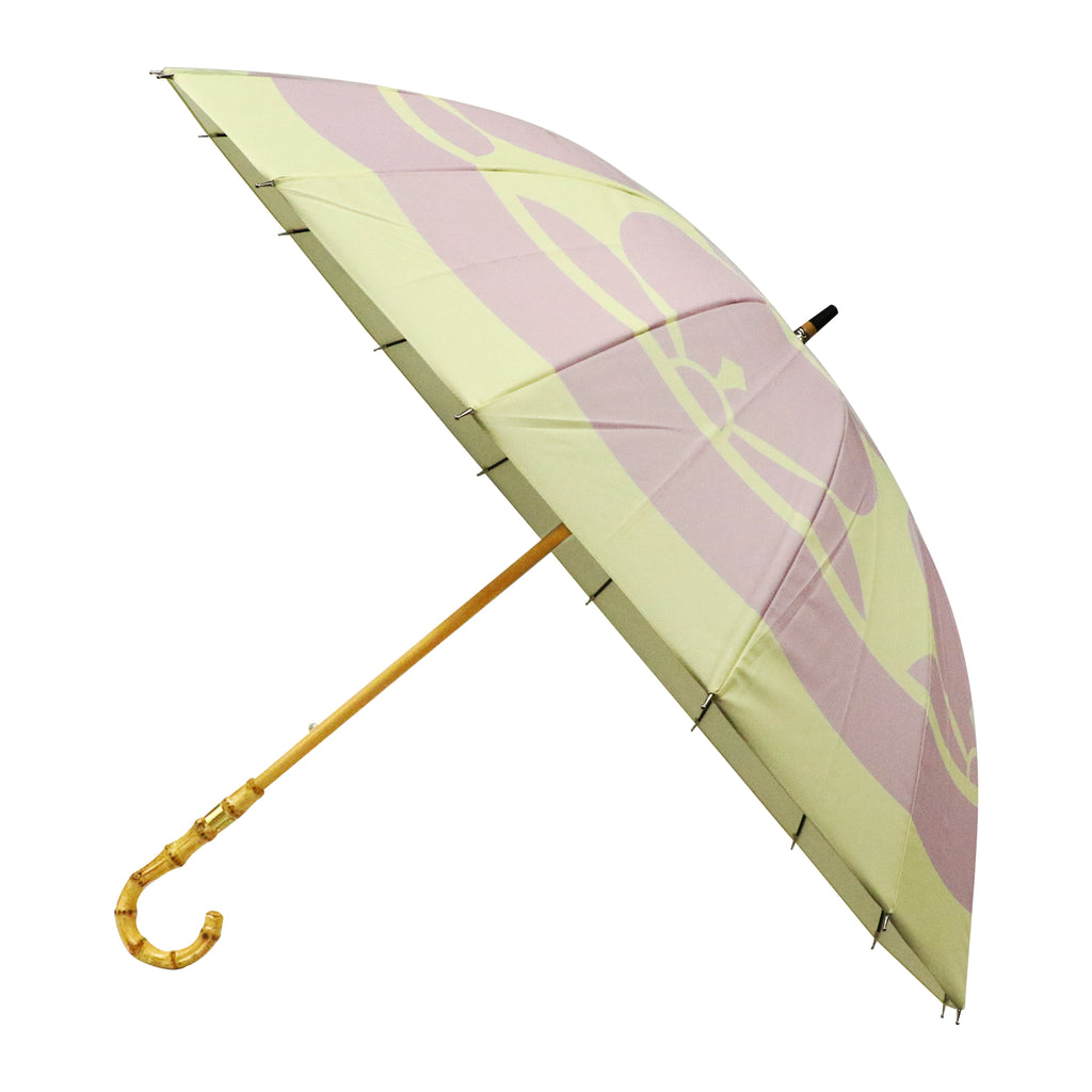 傘布全面に大胆でモダンな和柄のグラフィックデザインを施した16本の骨組の長傘です。16本の骨組みに合わせて柄を職人による手作業でつなぎ合わせており、繋ぎ目も綺麗です。持ち手には節がしっかりとした天然の竹を使用、粋で高級感もたっぷりの仕様です。竹には曲げ加工を施し、持ちやすくかわいらしいシルエットに。また、ブランドロゴを施したオリジナルプレートを使用。骨組みには軽くてしなやかにしなるグラスファイバーを用い、丈夫で雨風にも強い傘となっています。黒色の骨はサビが目立ちにくく、デザイン性と使いやすさと備えた長傘です。またUVカットを施しておりますので、晴雨兼用で日傘としてもお使いいただけます。