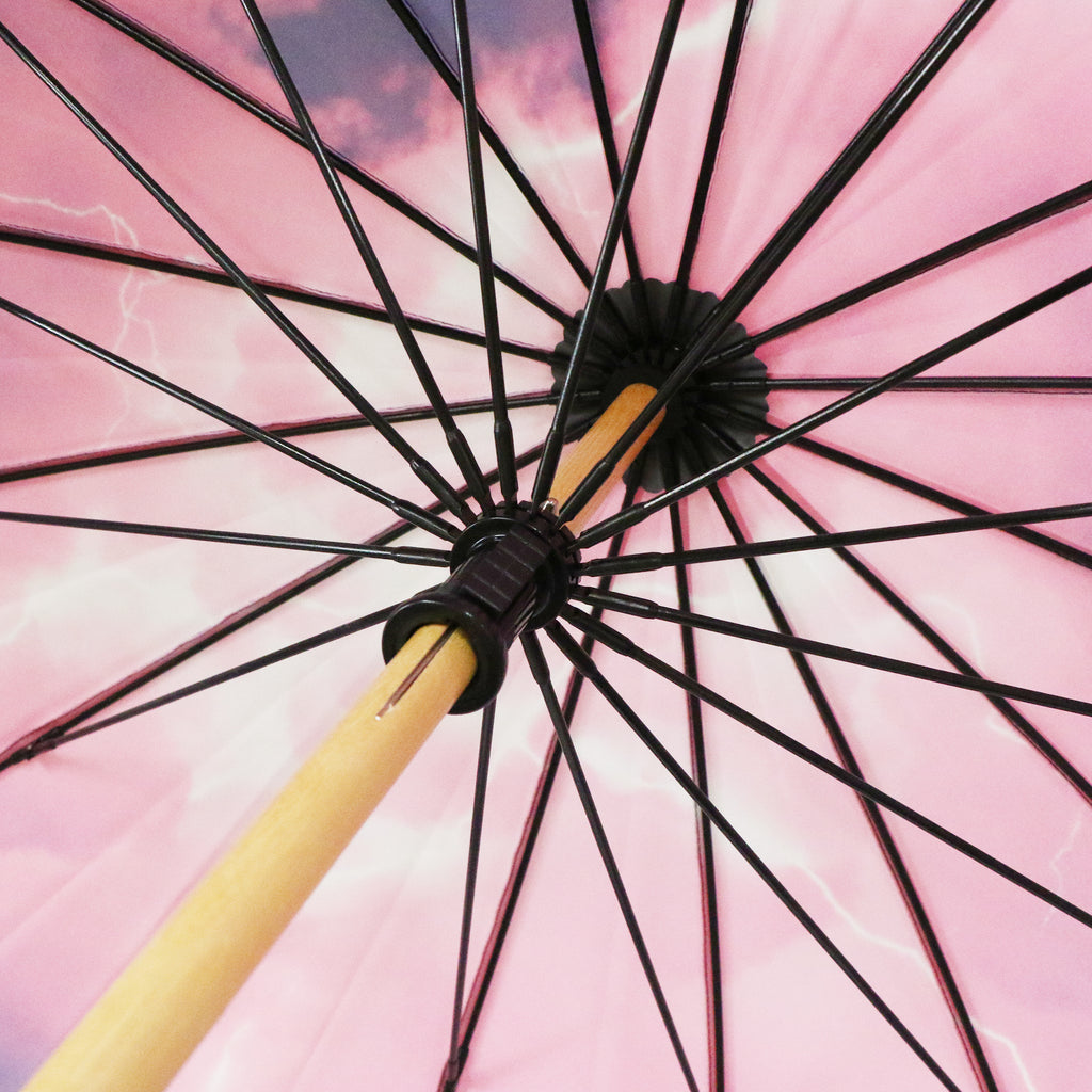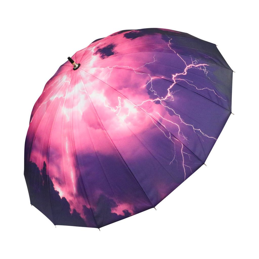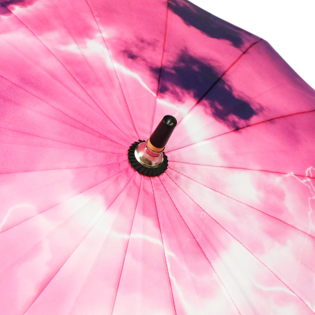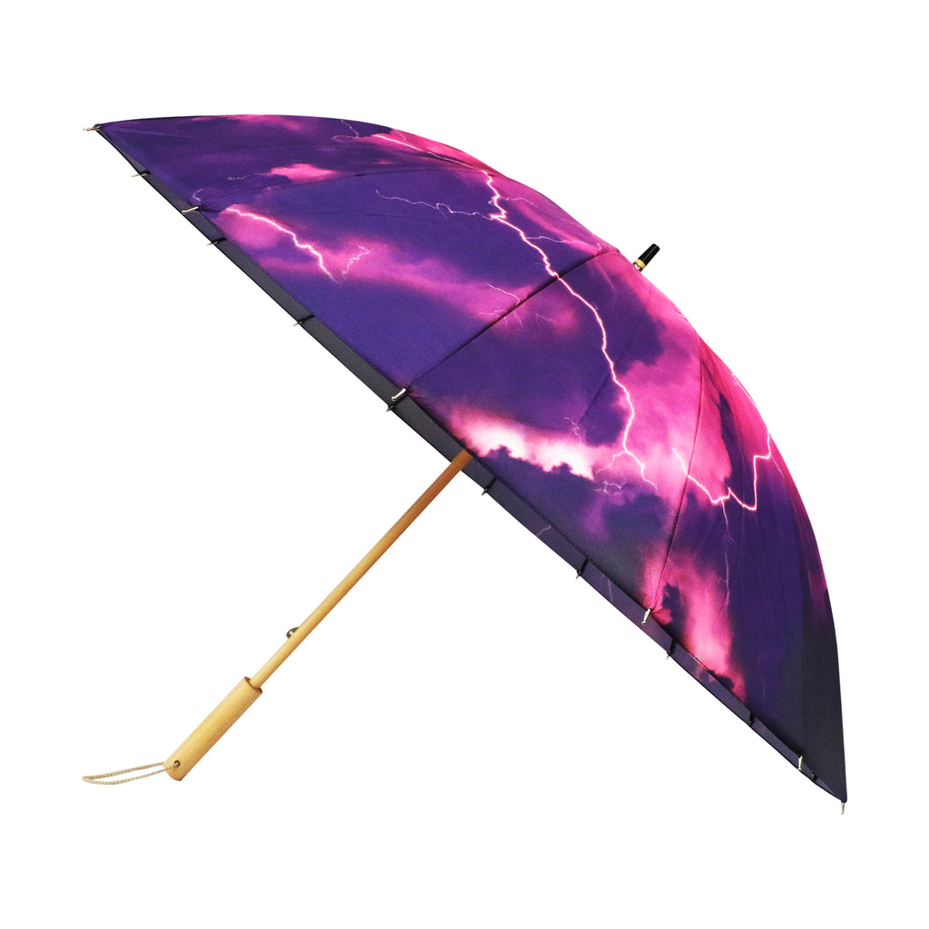 黒々と全体を覆う暗い雲の隙間から光を放つ雷を描いた16本骨傘です。