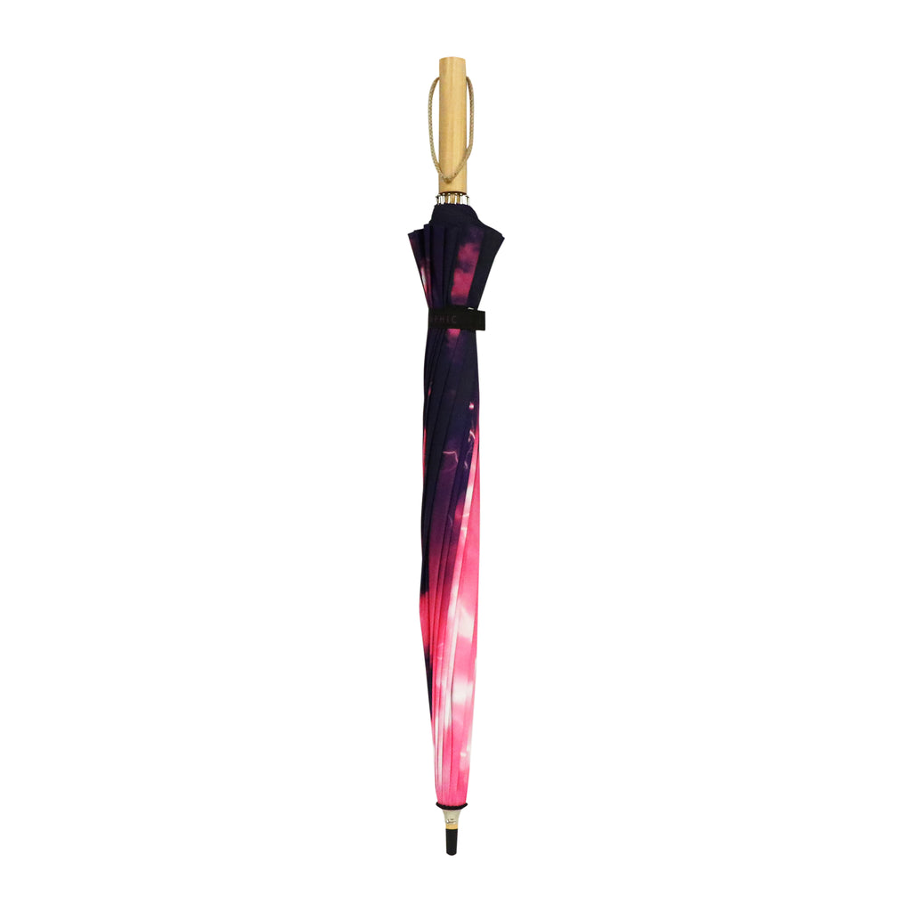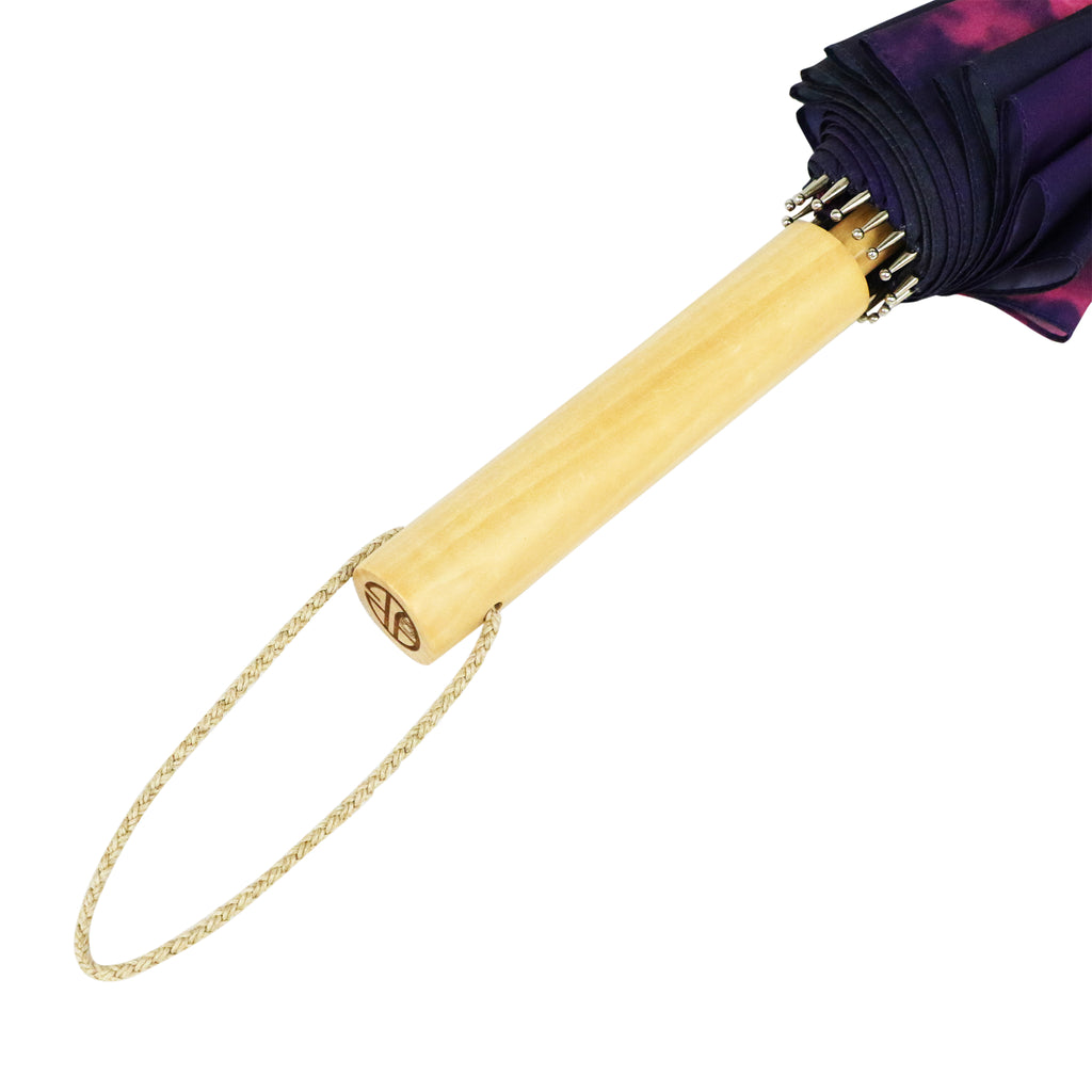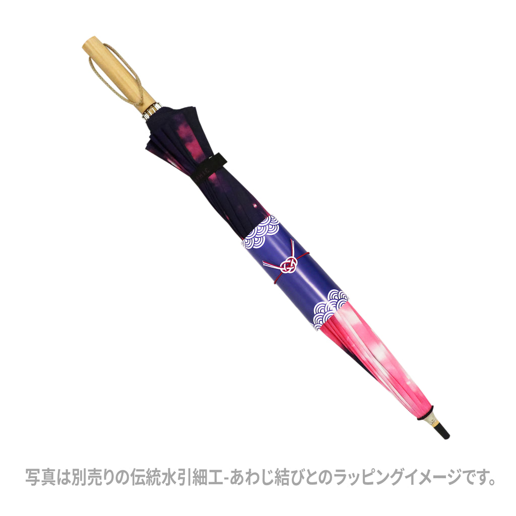傘布全面に大胆でモダンな和柄のグラフィックデザインを施した16本の骨組の長傘です。16本の骨組みに合わせて柄を職人による手作業でつなぎ合わせており、繋ぎ目も綺麗です。軸は手に馴染むよう天然木(エンジュ)を使用。持ち手の馴染みやすさだけでなくく、手開き傘のぐっと持ち上げた時もなめらかに開きます。骨組みには軽くてしなやかにしなるグラスファイバーを用い、丈夫で雨風にも強い傘となっています。黒色の骨はサビが目立ちにくく、デザイン性と使いやすさと備えた長傘です。またUVカットを施しておりますので、晴雨兼用で日傘としてもお使いいただけます。