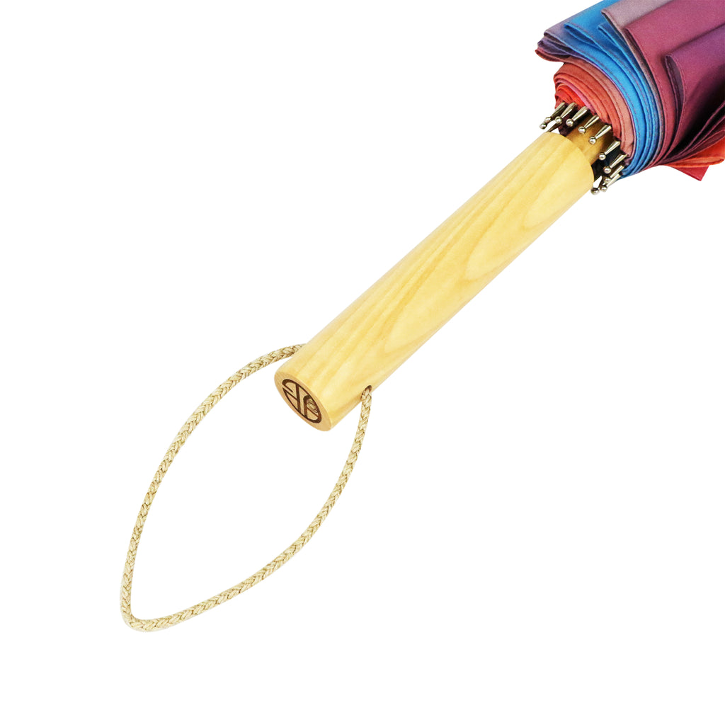 傘布全面に大胆でモダンな和柄のグラフィックデザインを施した16本の骨組の長傘です。16本の骨組みに合わせて柄を職人による手作業でつなぎ合わせており、繋ぎ目も綺麗です。軸は手に馴染むよう天然木(エンジュ)を使用。持ち手の馴染みやすさだけでなくく、手開き傘のぐっと持ち上げた時もなめらかに開きます。骨組みには軽くてしなやかにしなるグラスファイバーを用い、丈夫で雨風にも強い傘となっています。黒色の骨はサビが目立ちにくく、デザイン性と使いやすさと備えた長傘です。またUVカットを施しておりますので、晴雨兼用で日傘としてもお使いいただけます。