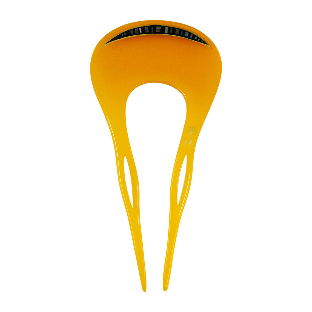 透き通る飴色の艶めき。螺鈿(らでん)のラインがモダンに瞬く、べっ甲調のかんざし。