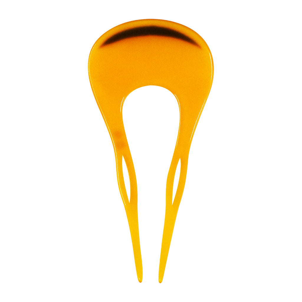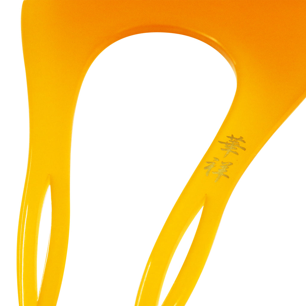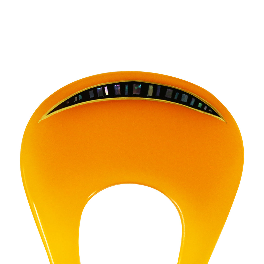 透光性のある美しい飴色のボディは、肌馴染みが良く、黒髪にも茶髪にもしっとりと調和します。 扇面のトップには、夜空に浮かぶ三日月のようなカーブを描く螺鈿細工を配置。クラシカルなべっ甲調の風合いに、シェル特有の幻想的な輝きとシャープなデザインが加わり、伝統的でありながら現代的な洗練さを感じさせる仕上がりです。