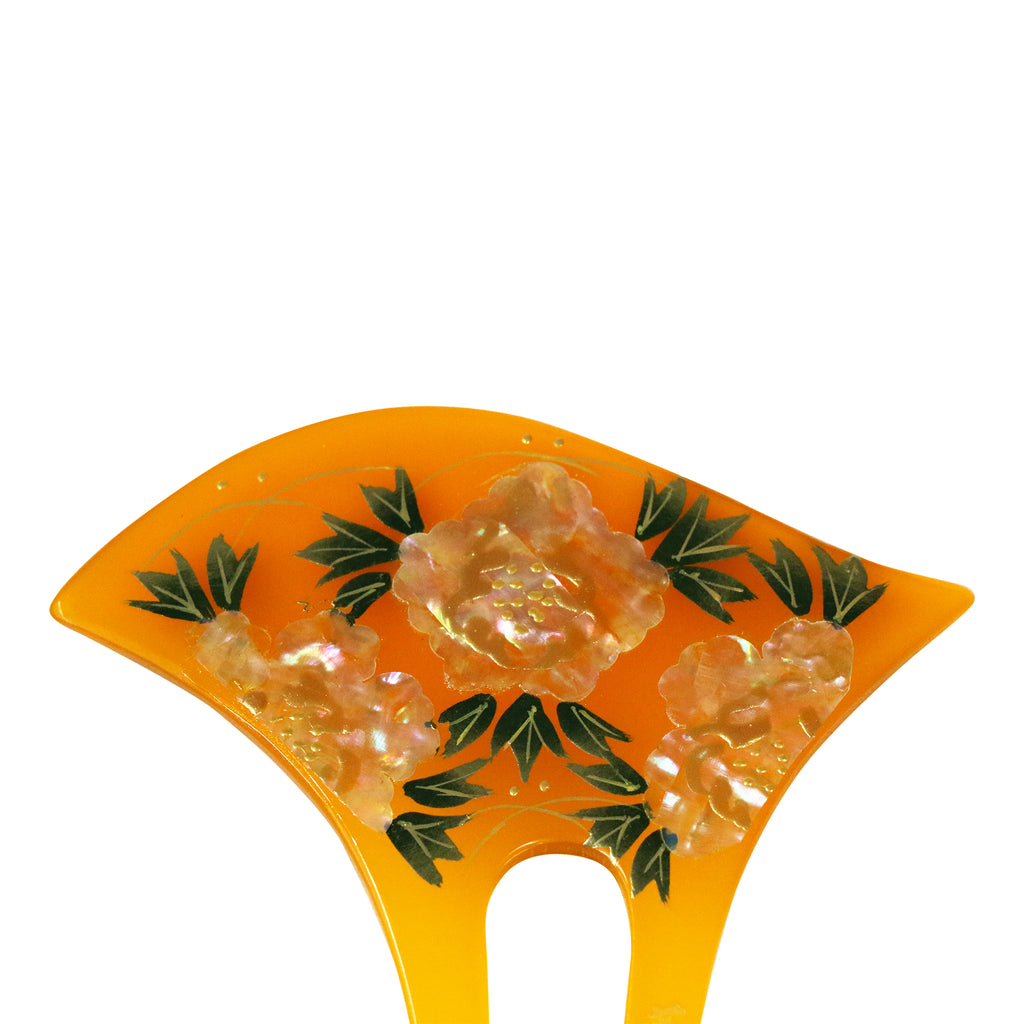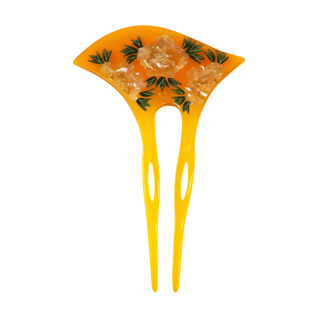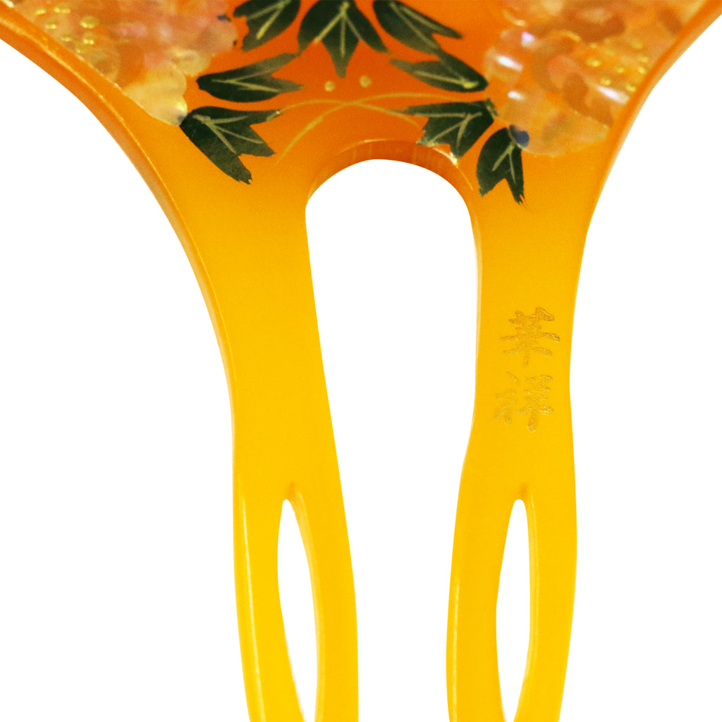 透光性のある美しい飴色のボディは、肌馴染みが良く、黒髪にも茶髪にもしっとりと調和します。 扇面のトップには、夜空に浮かぶ三日月のようなカーブを描く螺鈿細工を配置。クラシカルなべっ甲調の風合いに、シェル特有の幻想的な輝きとシャープなデザインが加わり、伝統的でありながら現代的な洗練さを感じさせる仕上がりです。