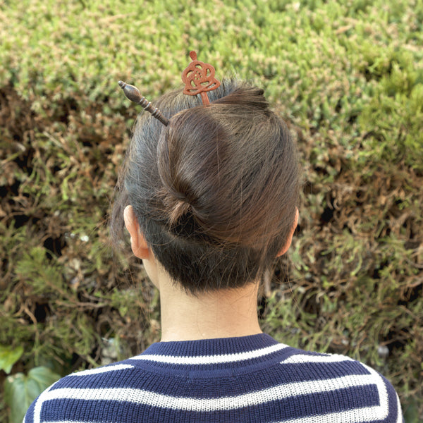 一本一本全て職人が手で彫りあげており、味わい深い仕上げになっています。紅檀の、硬質でしっとりとした雰囲気は大人っぽい印象ながら、シンプルなのでカジュアルにもお使い頂ける一本です。特徴として、深みのある色合いで緻密かつ重厚そして堅固な材質。丁寧に仕上げたその手触りは滑らかで、上品な光沢感があります。使い込めば独特の風合いが生まれ、あなただけの一本としていつまでも永くお使いいただけます。手彫りならではの質感と、重厚な深みのある光沢感をお楽しみください。木は滑りにくいので、髪の多い方でも1本で簡単にまとめられるので初心者の方にもおすすめです。シンプルに象ったデザインは、他の簪との相性も良く、重ね付けにも最適です。